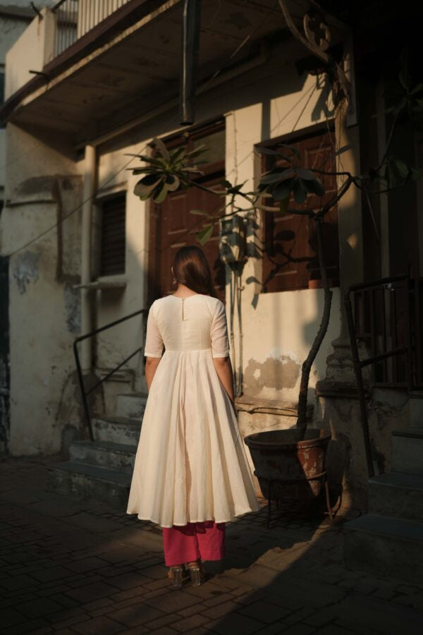 Effortless elegance meets traditional craftsmanship in our Dream Ivory Anarkali. Featuring intricate mirror embroidery on the yoke, a graceful flared silhouette, and contrasting pants — this set is perfect for festive days and evening gatherings.